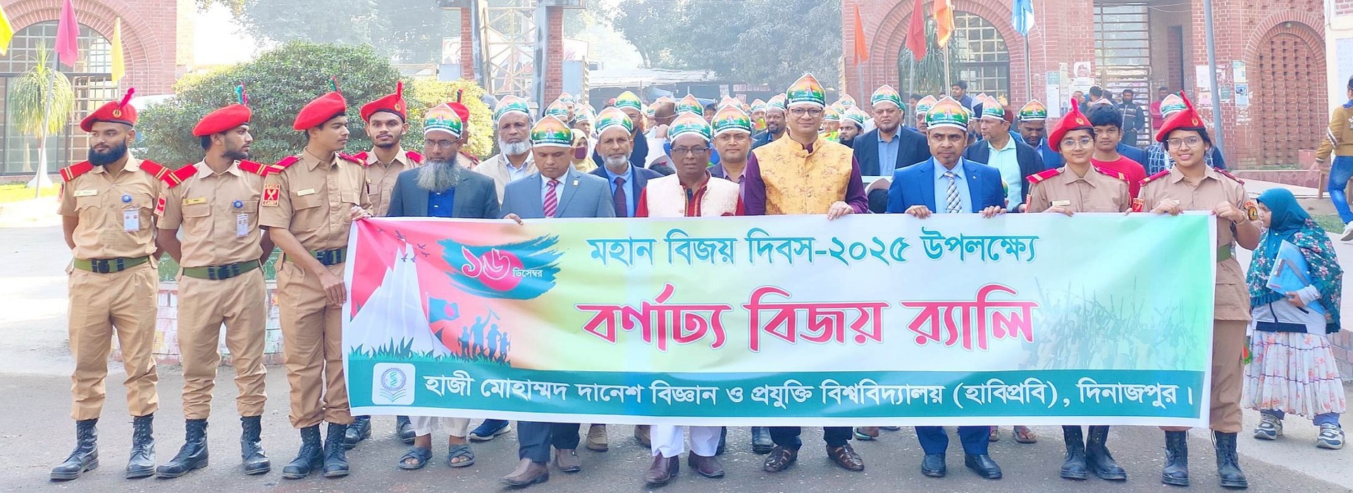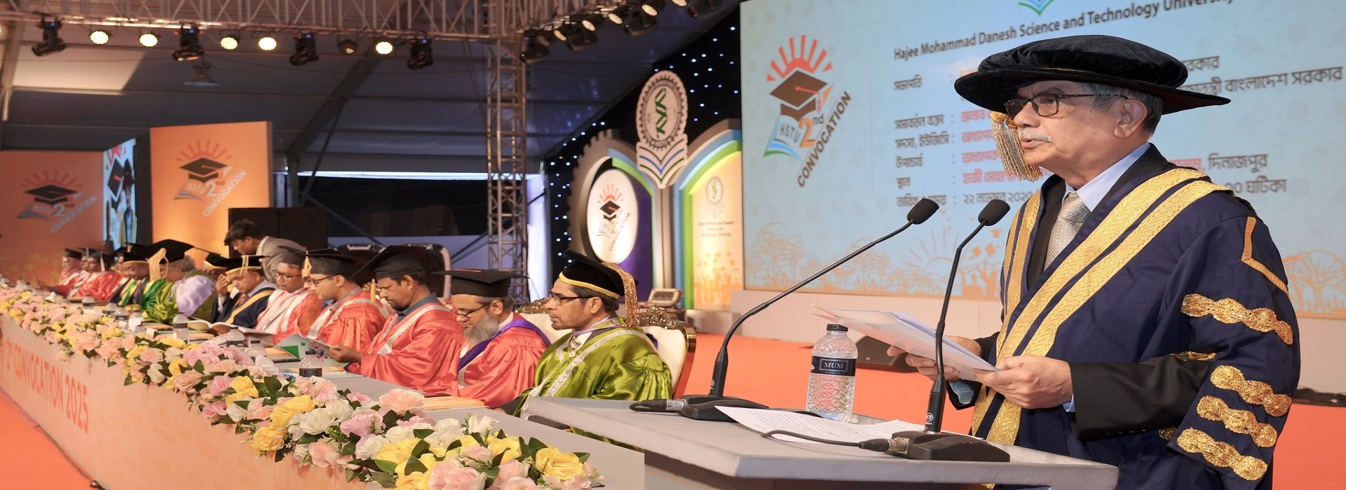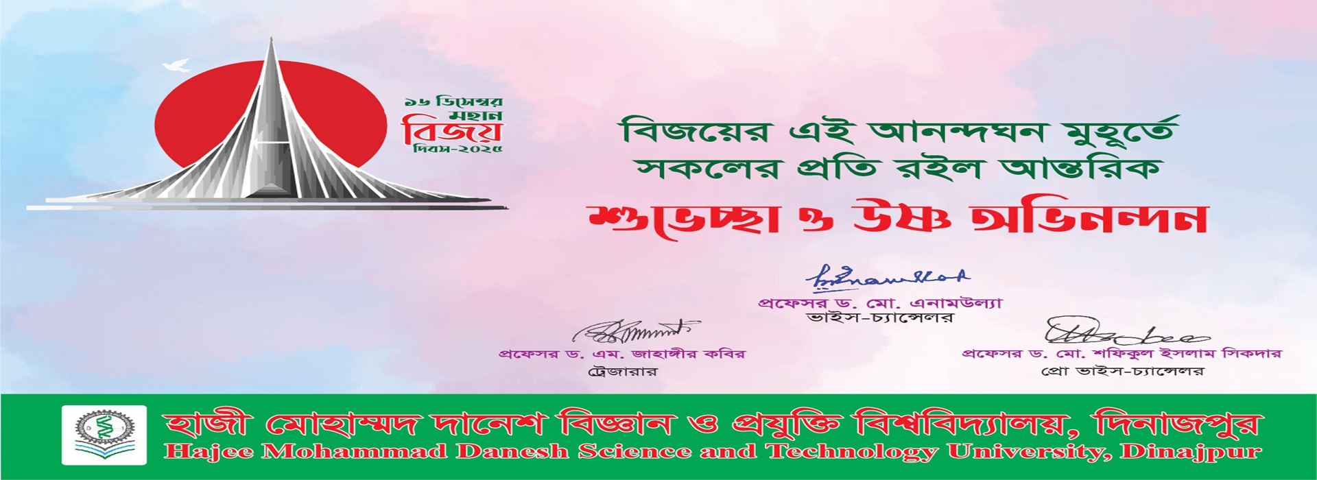 Hajee Mohammad Danesh Science and Technology University is the first Science and Technology University in the northern region of Bangladesh. It stands away from the urban Dinajpur and bustle at a beautiful and scenic location some 13km north of Dinajpur town by the side of the intercity highway that links Dinajpur to Dhaka, the capital of Bangladesh. Hajee Mohammad Danesh Science and Technology University was established as an Agricultural Extension Training Institute (AETI) to award a three-year diploma in agriculture. The AETI was later upgraded to Hajee Mohammad Danesh Agricultural College in 1988 having an affiliation from the Bangladesh Agricultural University, Mymensingh. Then the college was upgraded to the status of a university renaming it as Hajee Mohammad Danesh Science and Technology University. First batch of the students were admitted at that time (1999-2000 session). The Act of the University was passed on 8 July 2001 in the Jatio Shongsad (National Assembly) was followed by a gazette notification on 8 April 2002.