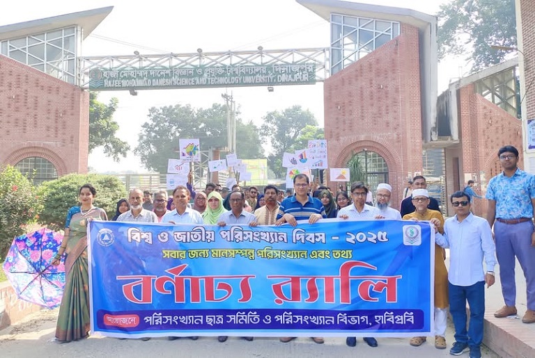 “সবার জন্য মানসম্মত পরিসংখ্যান এবং তথ্য” এই প্রতিপাদ্যকে সামনে রেখে “বিশ্ব ও জাতীয় পরিসংখ্যান দিবস ২০২৫” উপলক্ষ্যে হাজী মোহাম্মদ দানেশ বিজ্ঞান ও প্রযুক্তি বিশ্ববিদ্যালয়ে (হাবিপ্রবি) বর্ণাঢ্য র্যালির আয়োজন করা হয়। পরিসংখ্যান ছাত্র সমিতি ও পরিসংখ্যান বিভাগের আয়োজনে র্যালিটি প্রশাসনিক ভবনের সম্মুখ থেকে শুরু হয়ে ক্যাম্পাস প্রদক্ষিণ করে। র্যালির উদ্বোধন করেন হাবিপ্রবির মাননীয় ভাইস-চ্যান্সেলর প্রফেসর ড. মো. এনামউল্যা। এ সময় উপস্থিত ছিলেন প্রো ভাইস-চ্যান্সেলর প্রফেসর ড. মো. শফিকুল ইসলাম সিকদার, ট্রেজারার প্রফেসর ড. এম. জাহাঙ্গীর কবির, বিজ্ঞান অনুষদের ডীন প্রফেসর ড. মো. মোমিনুল ইসলাম, রেজিস্ট্রার প্রফেসর ড. মো. আবু হাসান, পরিসংখ্যান বিভাগের চেয়ারম্যান প্রফেসর ড. মো. সাইফুর রহমান, ছাত্র পরামর্শ ও নির্দেশনা বিভাগের পরিচালক প্রফেসর ড. এস.এম. এমদাদুল হাসানসহ অন্যান্য শিক্ষক, কর্মকর্তা ও শিক্ষার্থীবৃন্দ। অংশগ্রহণকারীরা পরিসংখ্যানের গুরুত্ব সংক্রান্ত বিভিন্ন প্ল্যাকার্ড ও ব্যানার প্রদর্শন করেন।