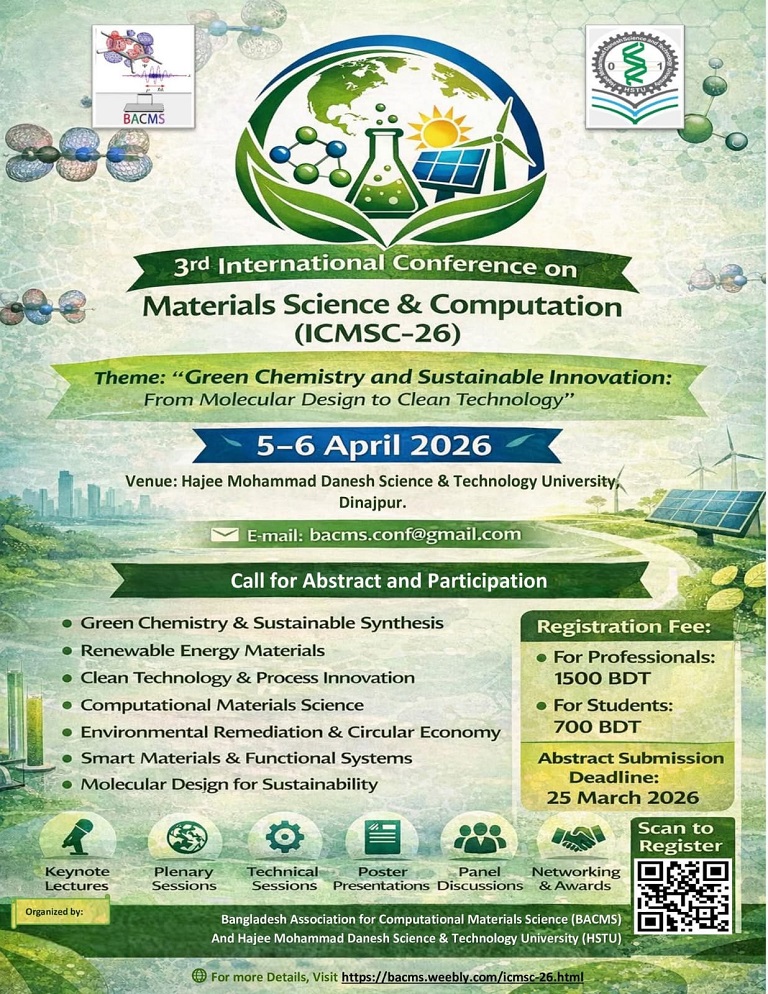 Bangladesh Association for Computational and Materials Science (BACMS) is pleased to announce the 3rd International Conference on Materials Science & Computation (ICMSC-26), to be held on 5-6 April 2026 at Hajee Mohammad Danesh Science & Technology University, Dinajpur.